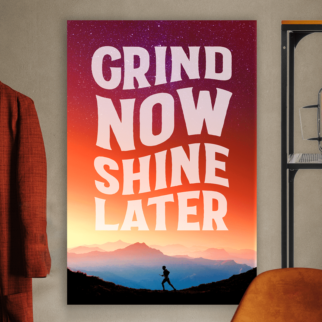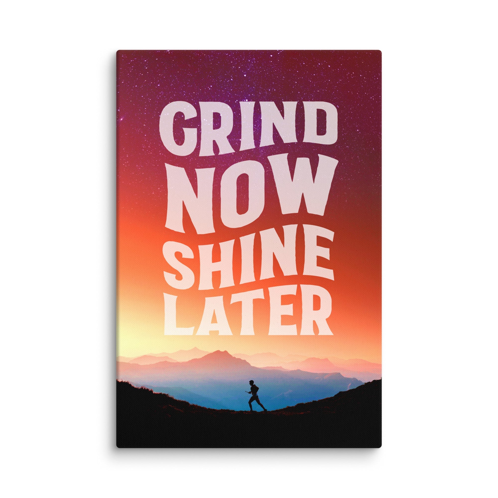 Everyone has their own unique dreams and aspirations in life that they want to reach as fast as possible, only some have the true patience to work towards it. The only way to reach your goals is to have the right mindset in place to stay motivated and put in the work. Believe in yourself and let your hustle speak louder than your words. This canvas will remind you to Grind Now, and Shine Later.