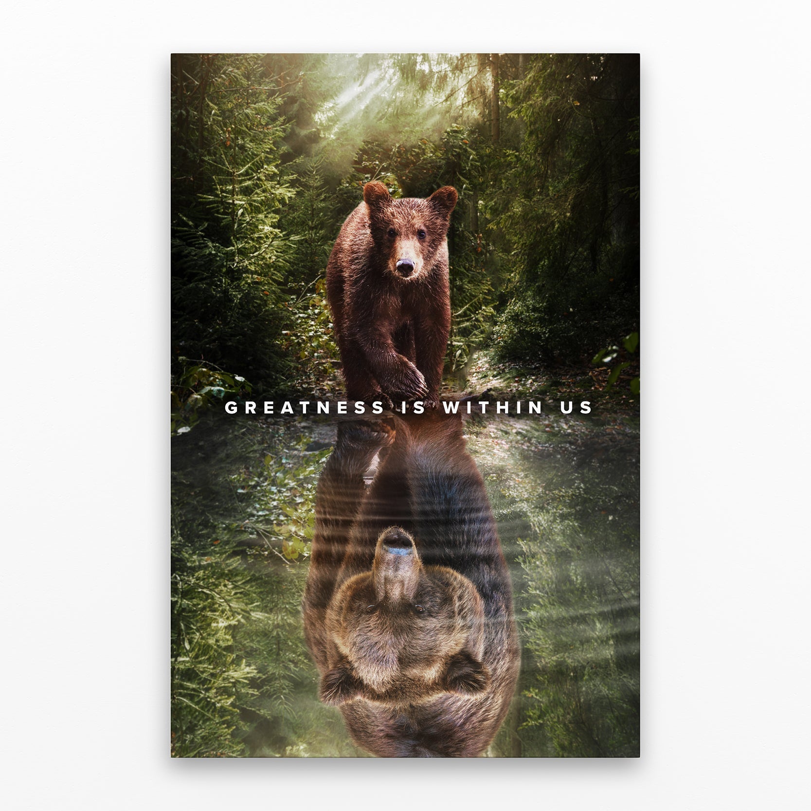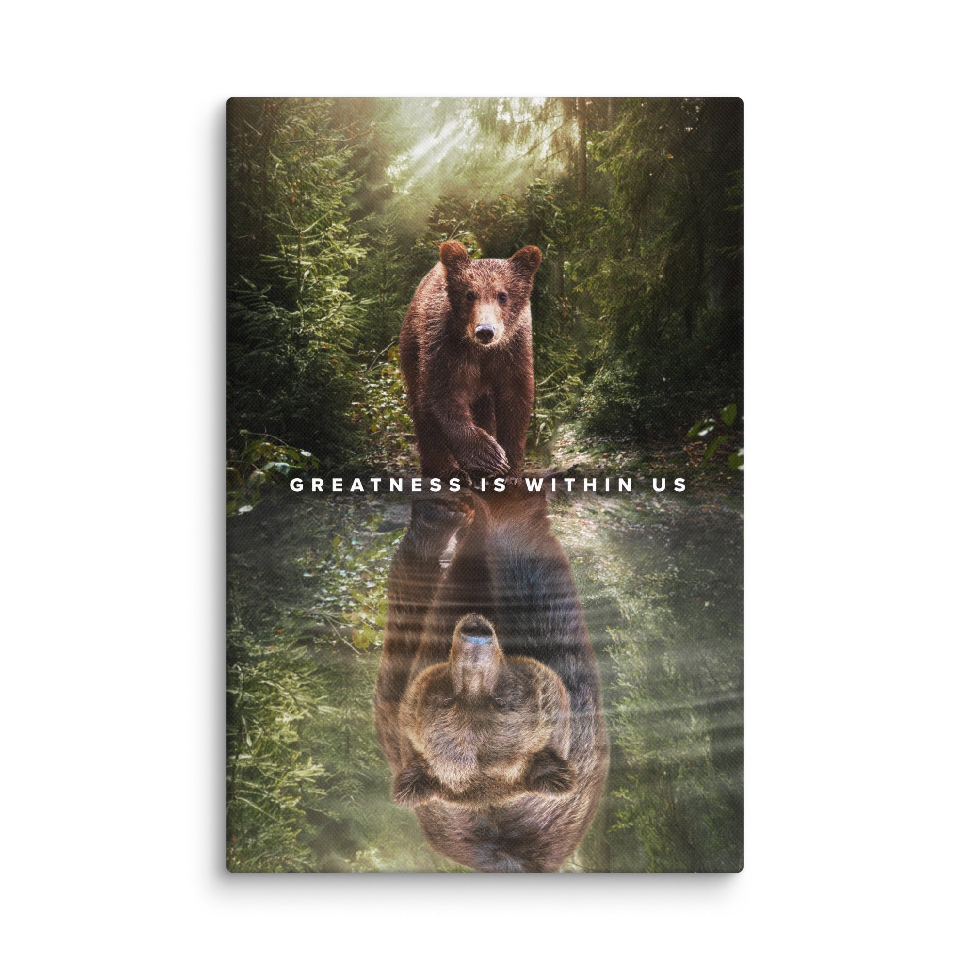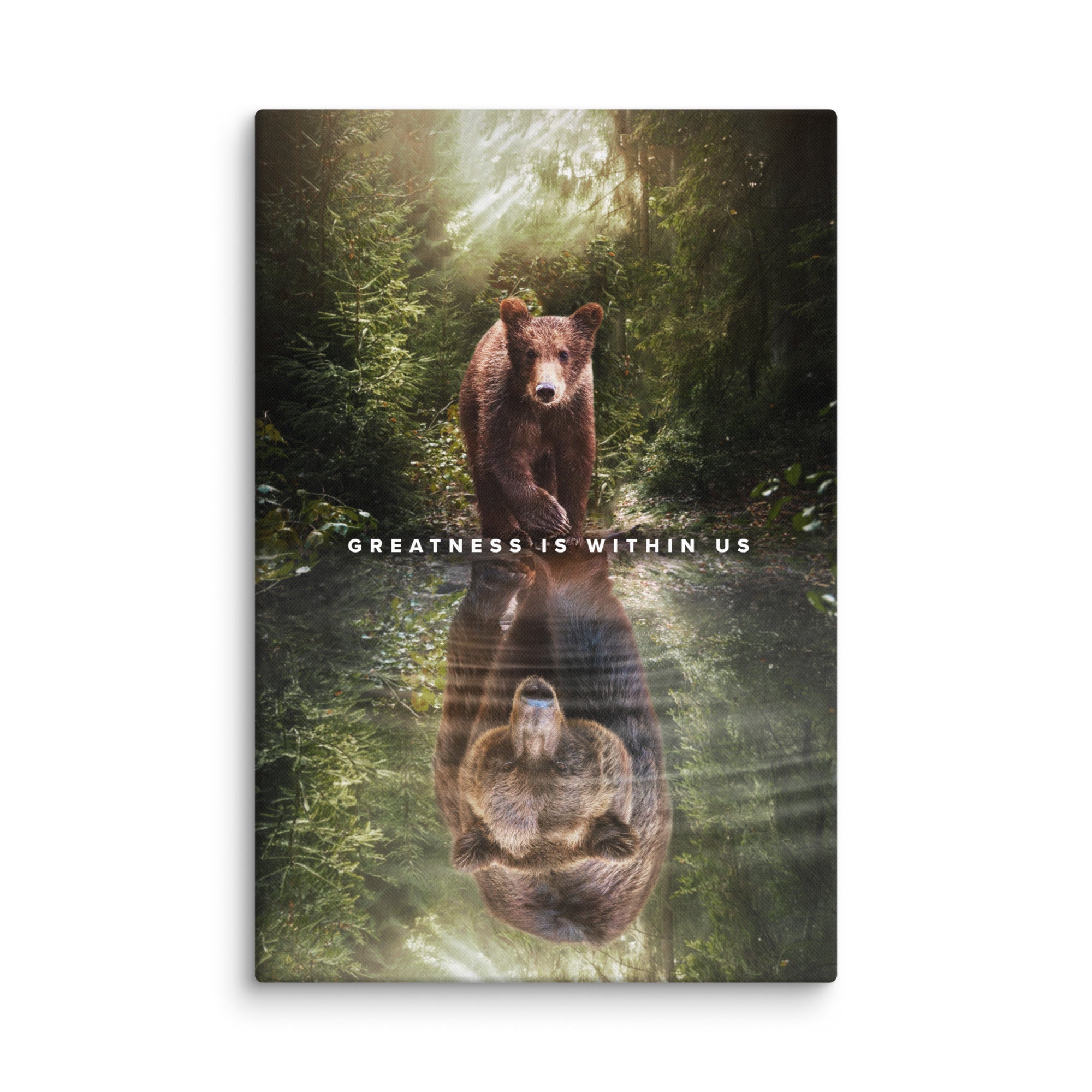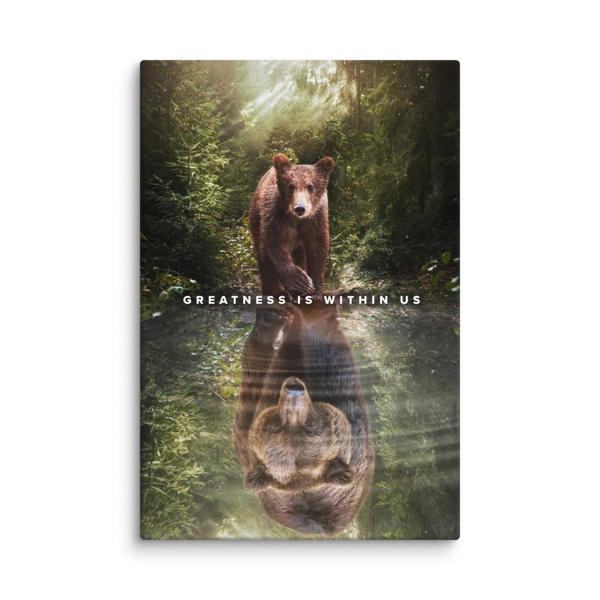 This canvas beautifully captures the profound concept of self-perception and the potential for greatness within each of us. The painting depicts a serene natural setting, with a bear cub gazing curiously into a body of water. A striking reflection of a majestic, larger bear emerges from the water, symbolizing the profound realization that our perception of ourselves holds the key to unlocking our true potential.