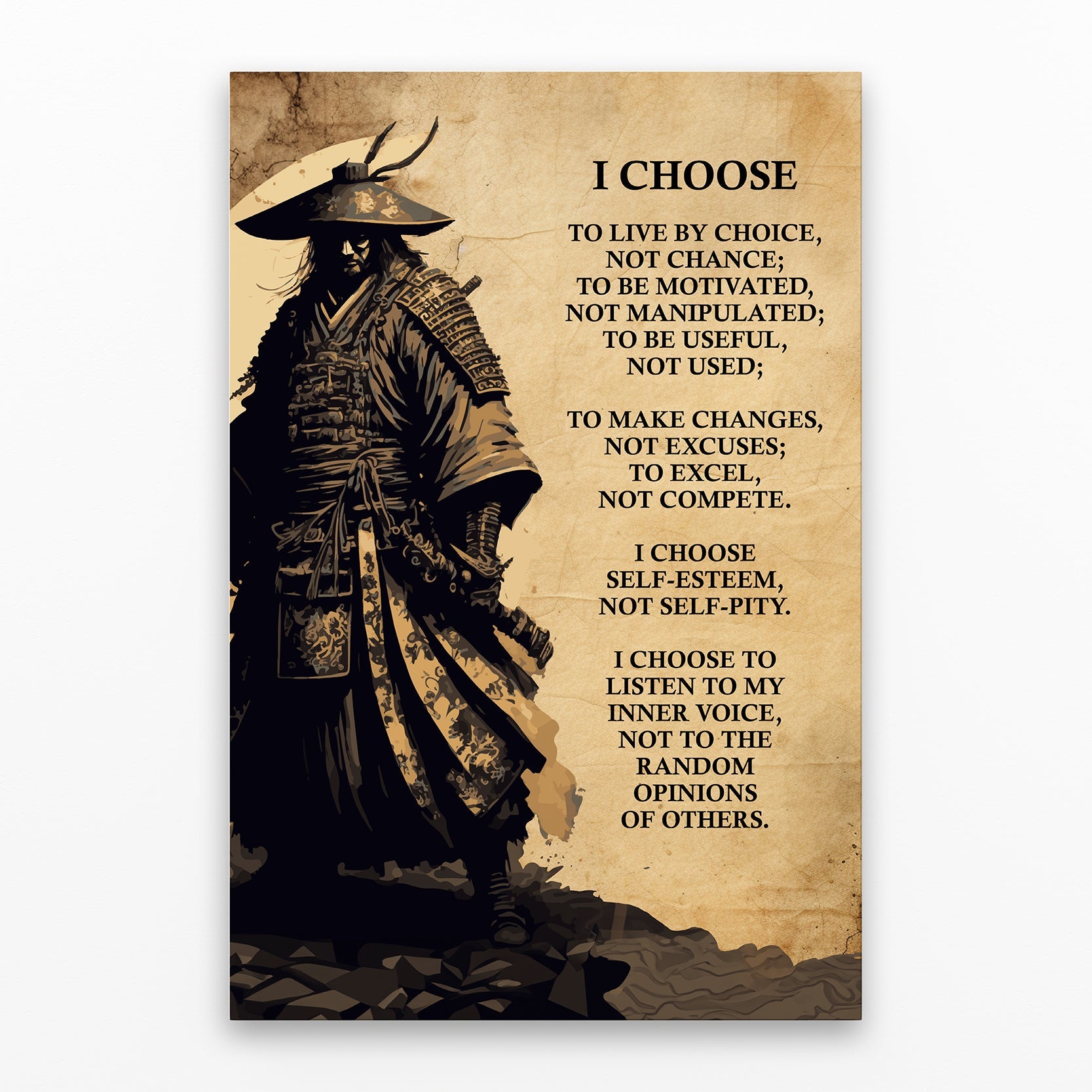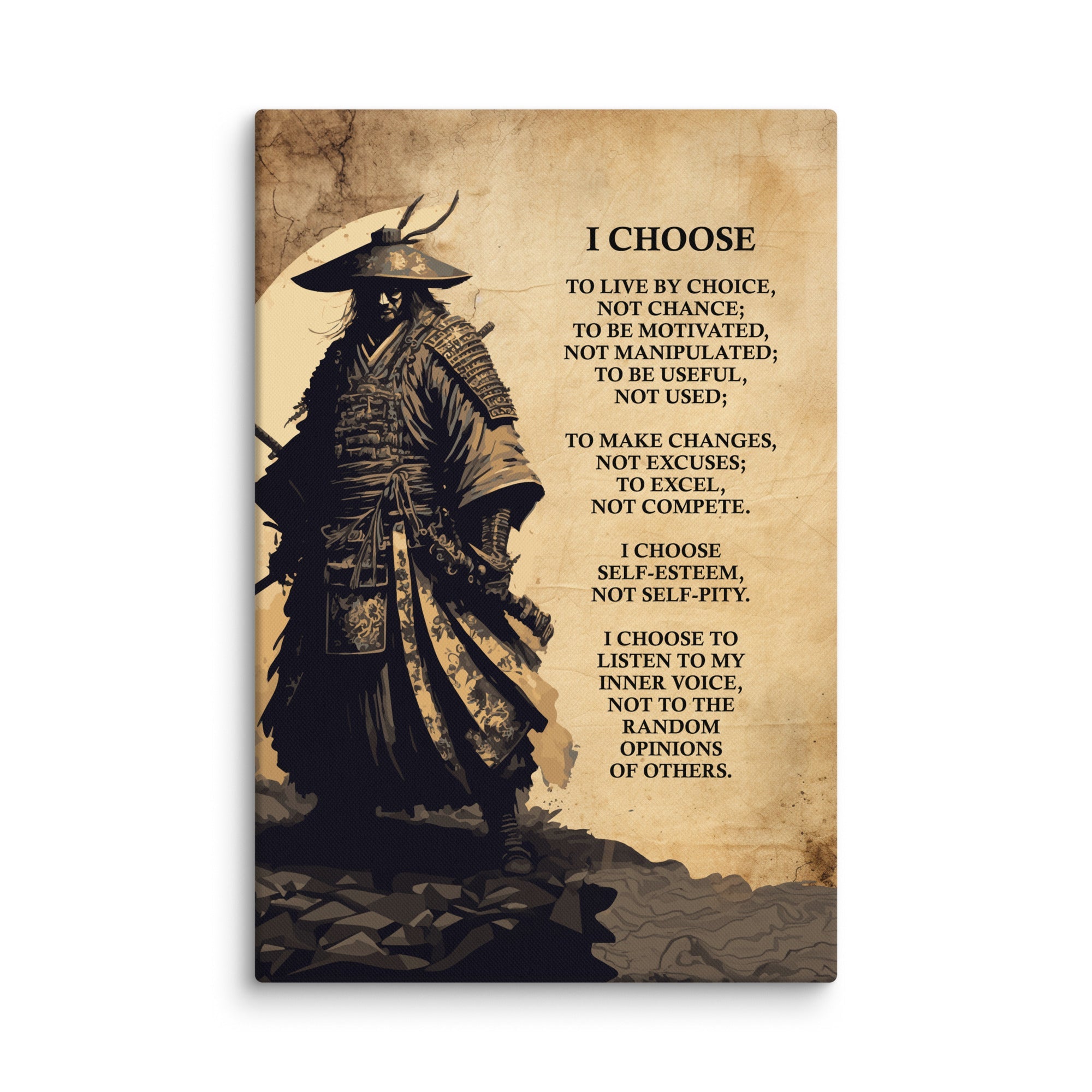 Elevate your space with our captivating Samurai Canvas, featuring the empowering quote "I choose to live by choice, not by chance." This inspirational artwork combines the timeless essence of a samurai with a profound message of personal growth and empowerment. This canvas embodies the spirit of embracing choices that shape our lives, making it an ideal addition to your collection of meaningful art pieces. Discover the art of intentional living through this exceptional samurai quote canvas that embodies the essence of choice and empowerment.
