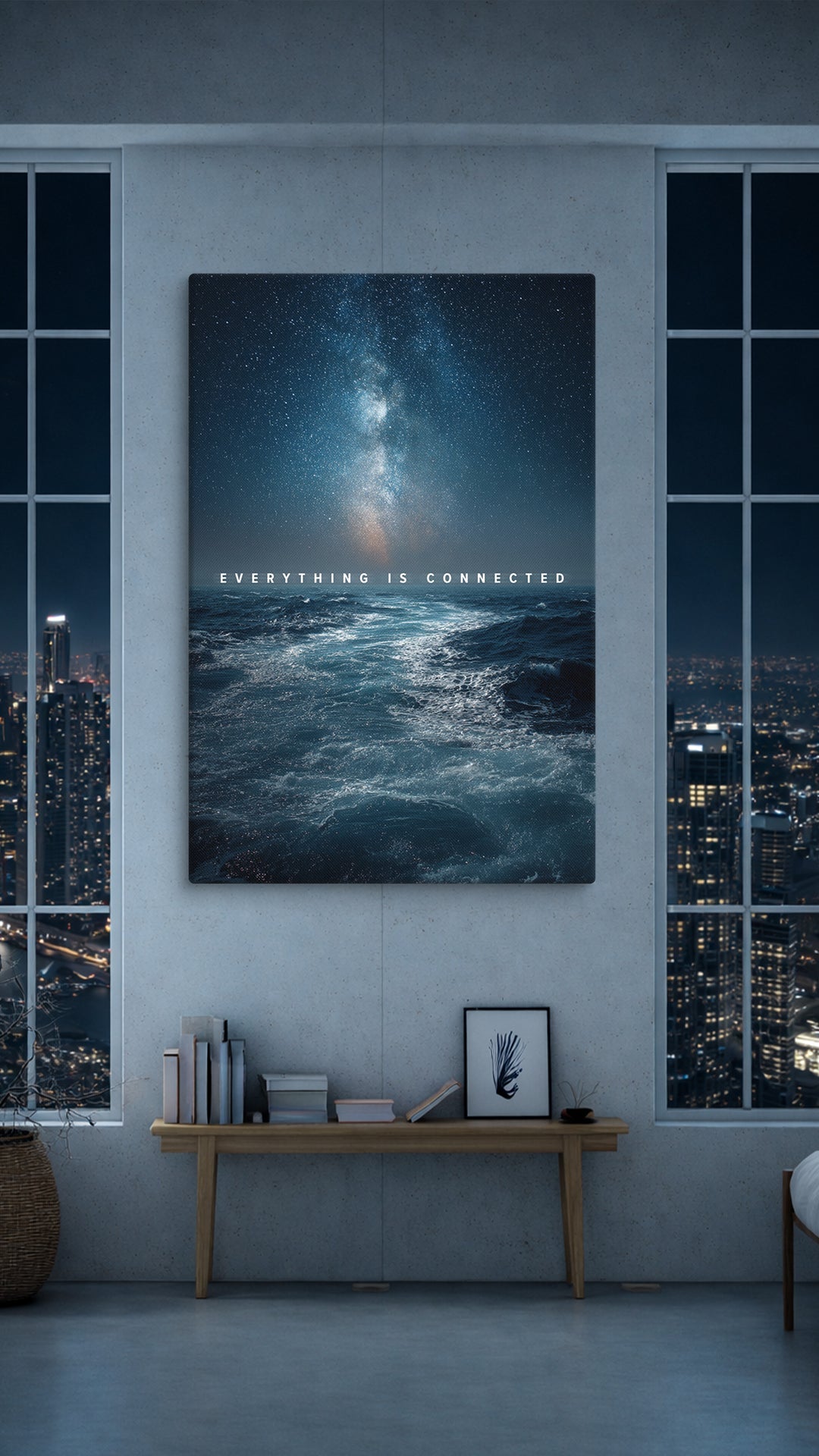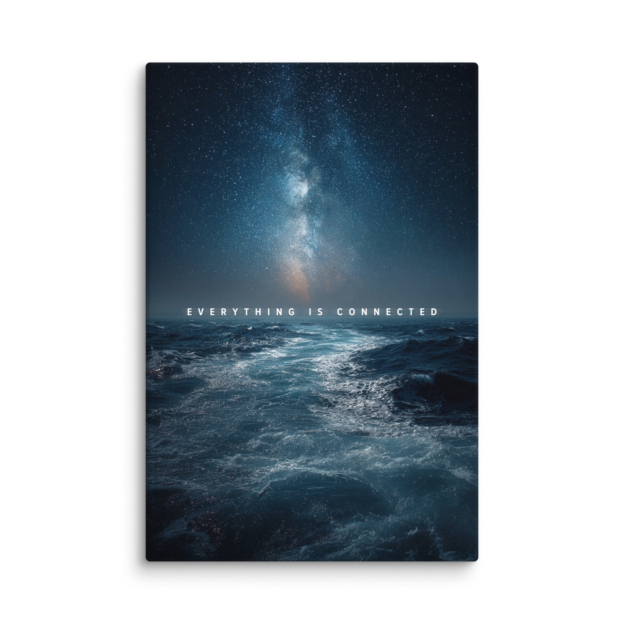 This canvas captures the quiet power of connection, where the vast night sky meets the restless ocean, and every movement feels part of something larger. “Everything Is Connected” is a visual reminder that no moment, decision, or path exists in isolation. The stars above and the waves below echo the same truth: nothing stands alone.