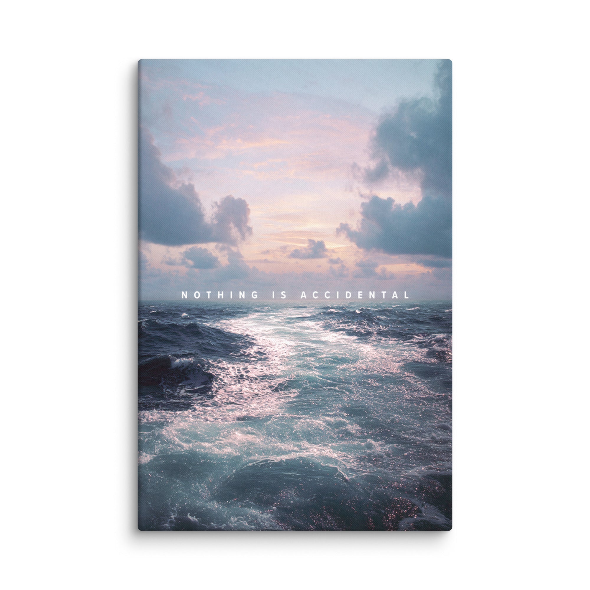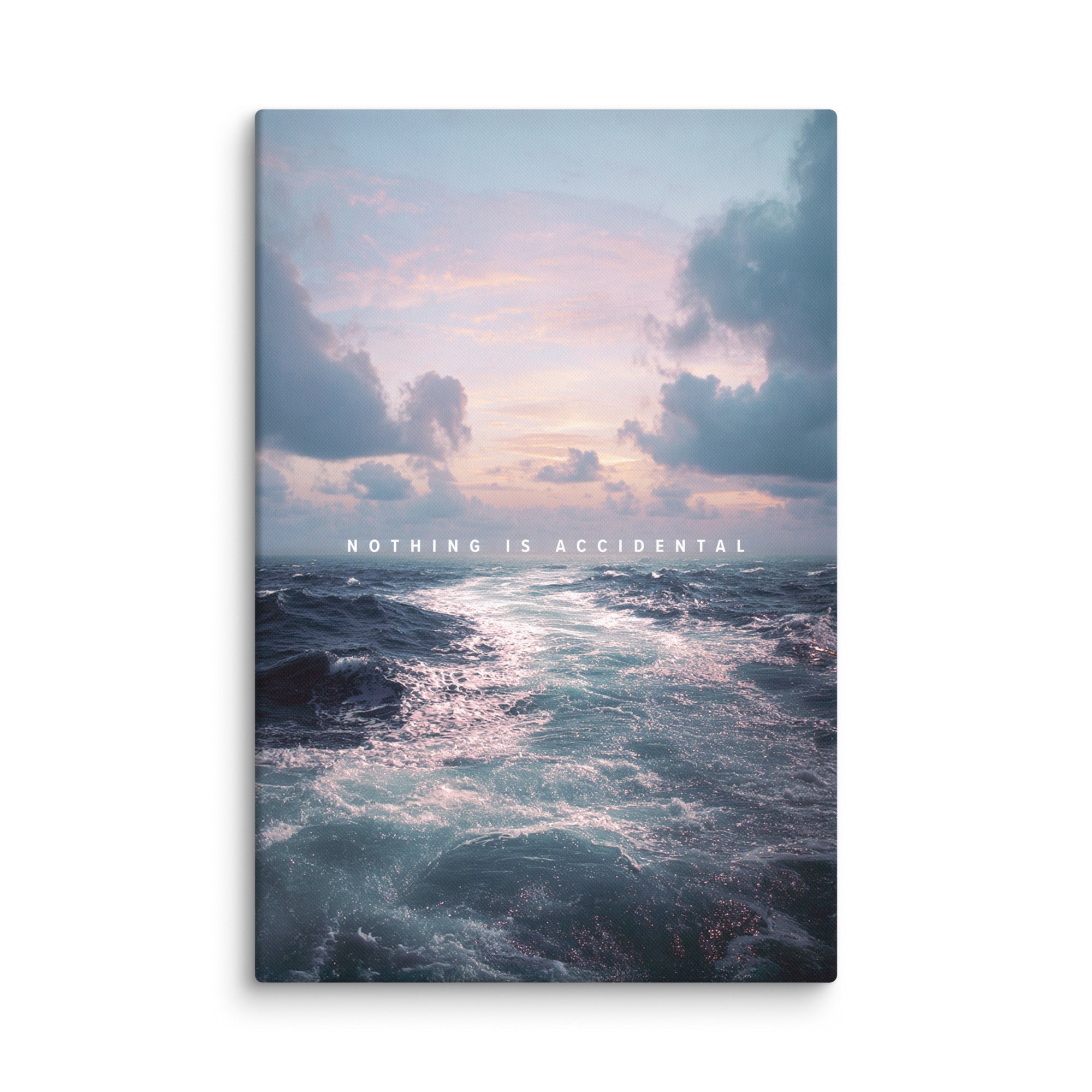 “Nothing Is Accidental” captures the quiet certainty beneath movement and change. Soft morning light breaks through drifting clouds as the ocean stretches forward, open, unfolding, intentional. This canvas is a reminder that even when life feels uncertain, there is direction beneath the surface.